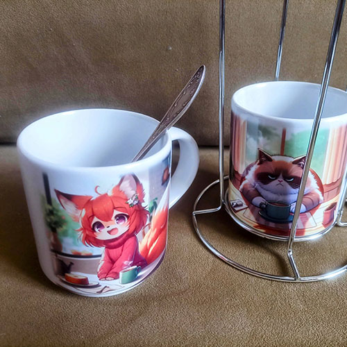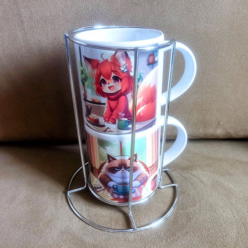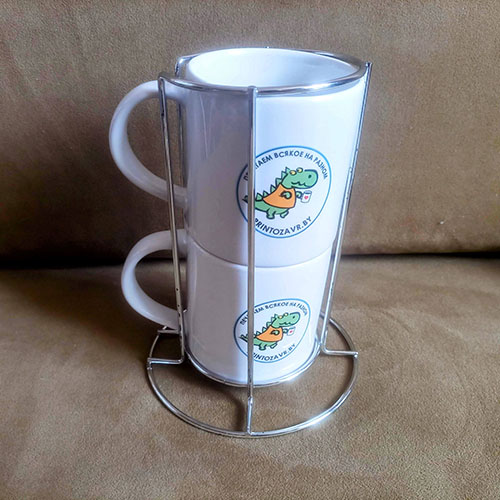 Создайте незабываемый подарок или сувенир с помощью печати на кофейных чашках! Наши кофейные наборы состоят из двух или четырех керамических кружек в элегантной металлической стойке.